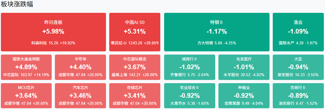 板块方面,半导体、CPO、证券、算力等板块涨幅居前,燃气、钢铁、银行、乳业等板块跌幅居前。截至收盘,沪指涨1.45%,深成指涨2.07%,创业板指涨3.36%。