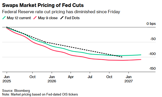 在中美两国周一发布联合声明缓和贸易紧张局势后,华尔街大行和利率市场上的交易员们纷纷降低了对美联储年内降息的押注,目前仅定价2025年会有两次降息,同时对下一次降息的窗口预期也出现大幅延后。