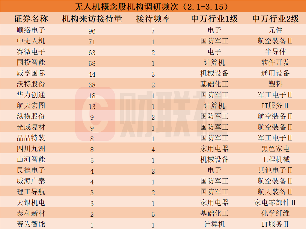 据Choice数据统计,2月1日至3月15日期间获机构调研的无人机概念股为顺络电子、中无人机、赛微电子、国投智能、咸亨国际、沃特股份、华力创通、航天宏图、纵横股份、光威复材、晶品特装、四川九洲、山河智能、民德电子、威海广泰、理工导航、天银机电、泰和新材和赛为智能,具体情况如下图: