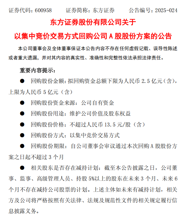4月8日盘前,东方证券发布提示性公告,公司坚定看好中国资本市场发展前景,积极维护公司价值及股东权益,拟以2.5亿元至5亿元资金回购公司A股股份。