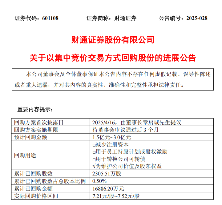 5月6日,财通证券发布公告,截至4月30日,通过集中竞价交易方式已累计回购2305.51万股,占总股本的0.5%,金额为1.69亿元,回购价格区间为每股7.21元至7.52元。