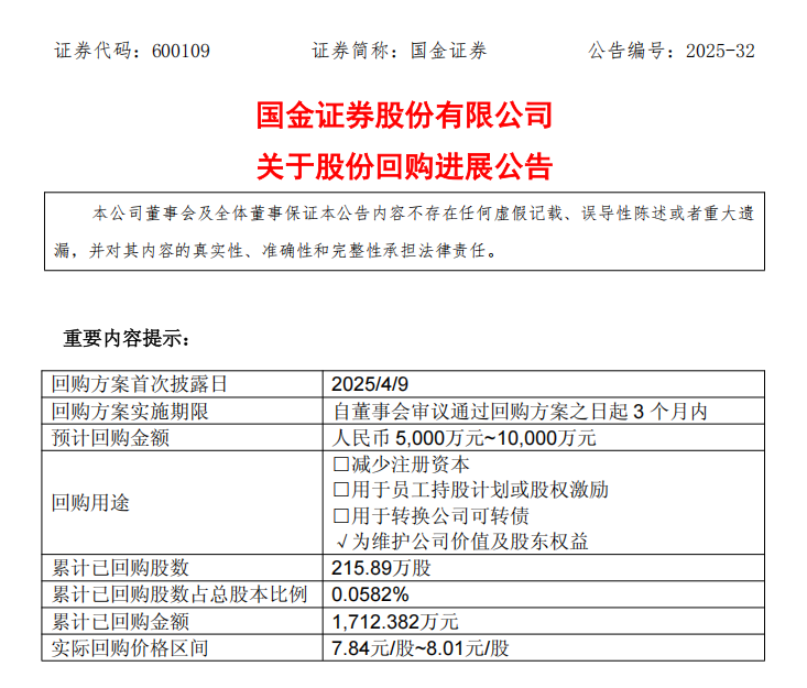 回溯到4月8日,国金证券公告称,公司拟使用自有资金以集中竞价交易方式回购公司股份,回购资金总额不低于5000万元,不超过1亿元。回购价格不超过每股12.91元。回购股份的用途为维护公司市场价值及股东权益。