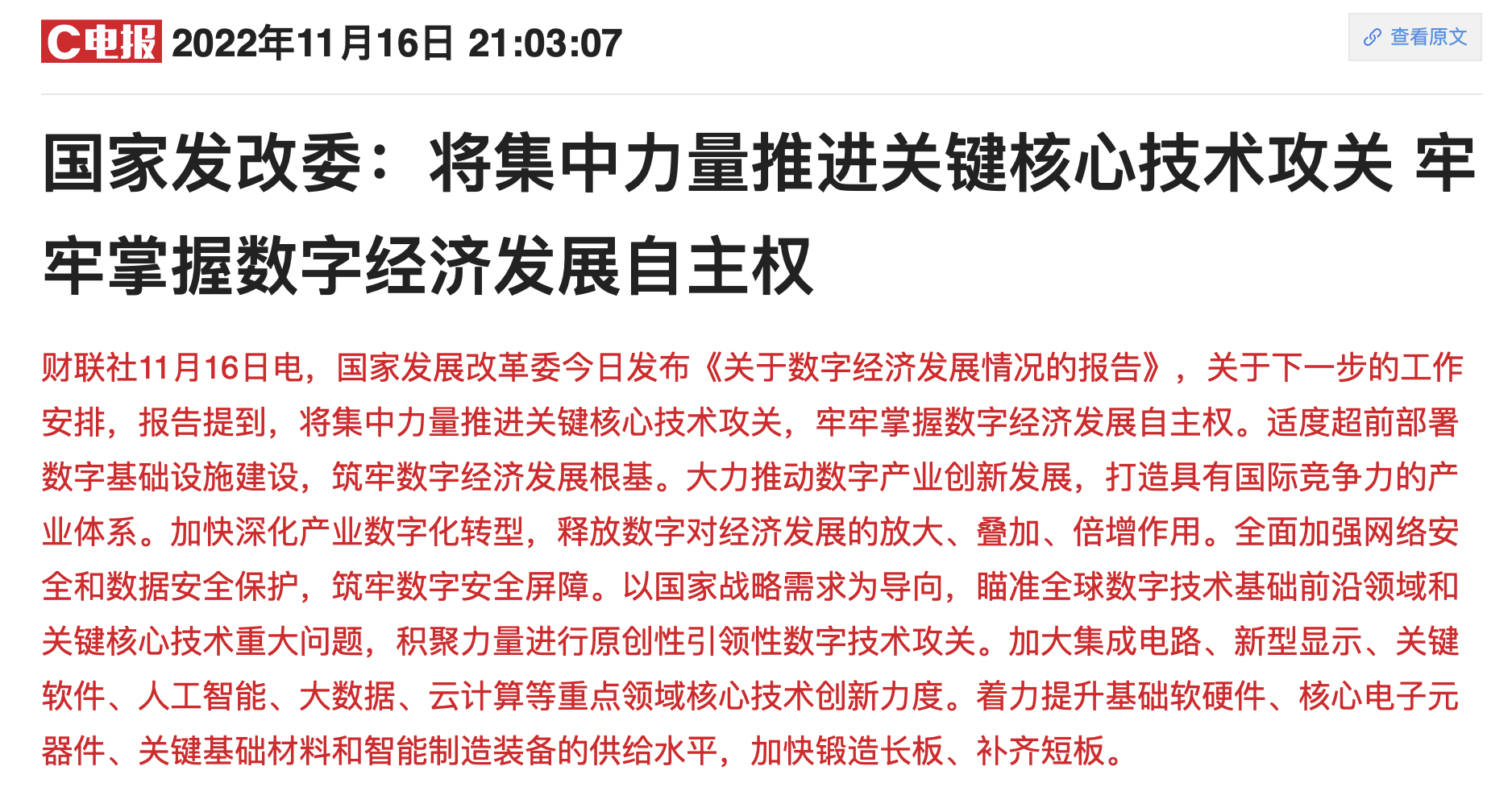 同时,国家发展改革委近日发布《关于数字经济发展情况的报告》提到,适度超前部署数字基础设施建设,筑牢数字经济发展根基。大力推动数字产业创新发展,打造具有国际竞争力的产业体系。