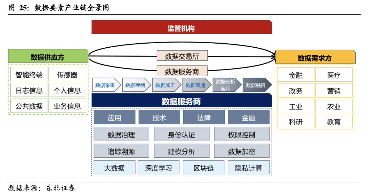 产业链来看,数据交易所连接着数据供应方和数据需求方,作为合法场内交易领域,当前主要由政府主导,也是政府参与数据要素的最主要方式。东北证券研报称,在2.0阶段下数据交易所更注重国有股权和生态建设,目前处于蓬勃发展和活跃探索阶段。