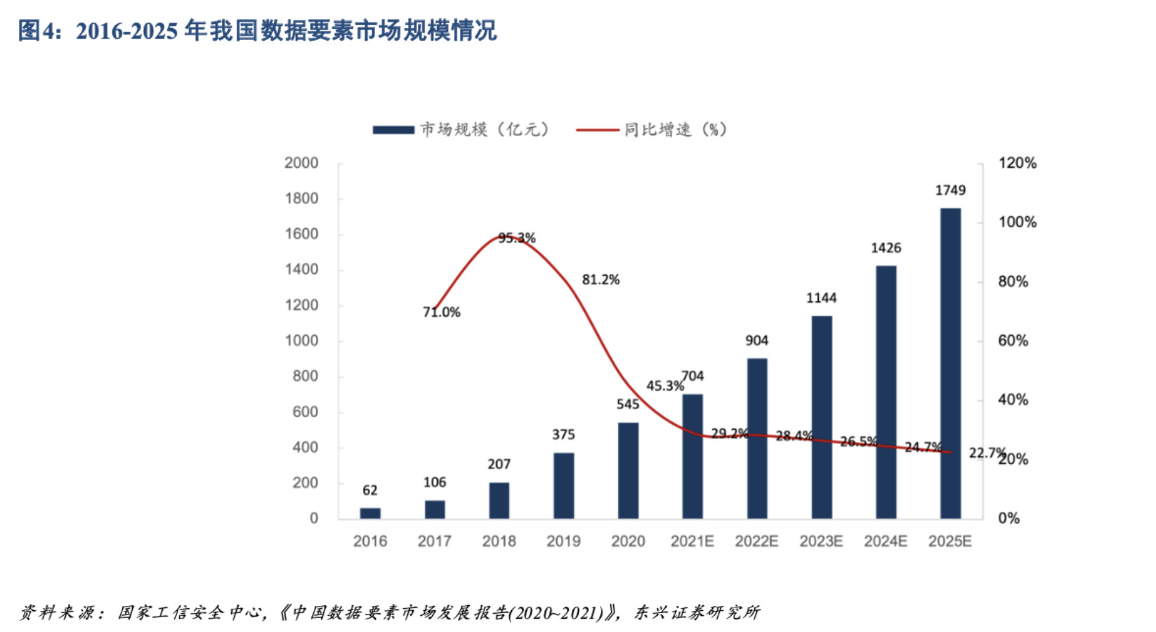 据国家工信安全中心测算数据,国内数据要素市场规模“十四五”期间将突破1749亿元。同时,市场正迎政策、技术等边际变化。华安证券研报认为,数据要素市场不可或缺前提下,我国数据交易发展空间巨大。