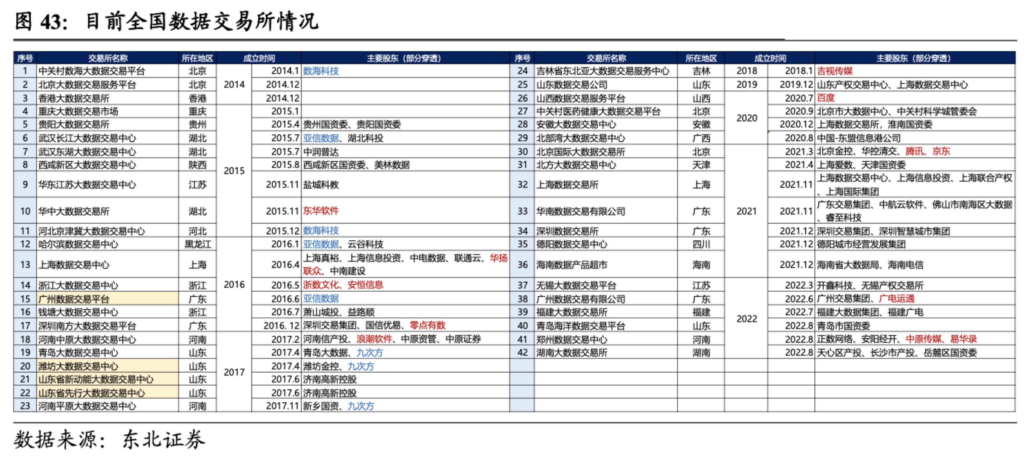 据不完全梳理,多家上市公司通过参股的方式涉及数据交易所产业链中,例如,华扬联众、中南建设为上海数据交易中心股东;东华软件为华中大数据交易所股东;浙数文化、安恒信息参股浙江大数据交易中心;浪潮软件、中原证券参股河南中原大数据交易中心;中原传媒、易华录参股郑州数据中心;广电运通参股广州数据交易有限公司。