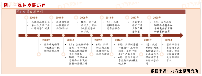 三棵树创立于2002年,是一家具有国内领先、行业独创“健康+”新标准的涂料生产和服务型制造企业,当前已成长为民族涂料第一品牌。自成立以来,公司已深耕建筑涂料二十载,并不断外延拓展业务品类,目前主营建筑涂料(墙面涂料)、防水材料、地坪材料、木器涂料、保温材料及保温一体化板、基辅材等产品的研发、生产和销售。2016 年上市, 2020 年跻身全球涂料上市公司市值前十。目前是中国民族涂料的龙头企业。创始人洪杰, 厦门大学硕士。福建本地名营企业。2016年在上交所上市,上市融资3.99亿,2016,2017,2018分别扩张了河南,安徽,河北生产销售基地。目前产能布局四川、河南、天津、安徽、河北、广东、湖北等建有9个生产基地。是国内涂料行业少数全国性涂料企业。