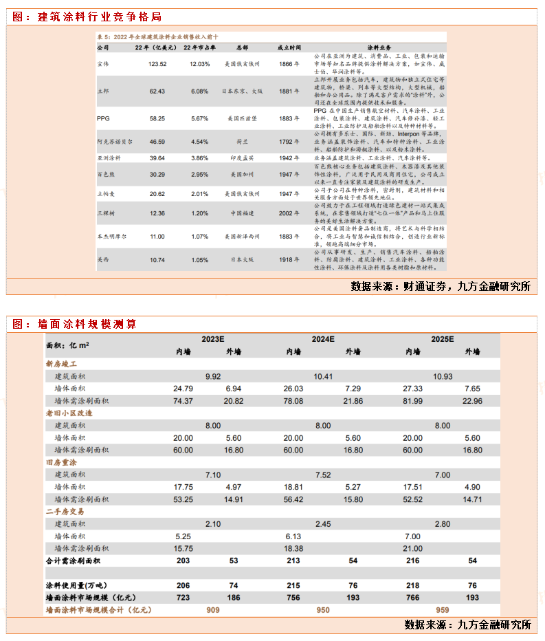 全球涂料龙头多为美、日百年企业,国内企业三棵树后来居上。据涂界统计,2022年全球建筑涂料企业销售收入前十中,美国企业5家、日本企业2家、 荷兰/印度/中国各 1 家,三棵树排第 8。按销售收入占比来看,宣伟占12.03%, 大幅领先第二立邦 6.08%的份额,三棵树 1.20%市占率,日本关西涂料占比 1.05%排最末。三棵树是唯一一家国产建筑涂料企业上榜的,是国内建筑涂料龙头。中国规模以上涂料企业产量自 2001 年的 123 万吨上升至 2022 年的 2442 万吨,CAGR 约 15.3%, 近期增速有所放缓,2022 年产量同比下降 8.2%。全球市占率来看,2022 年全 国全行业涂料产量 3488 万吨(含规模以下,按 70%折算),占全球 10016 万吨产量的 34.8%,较 2018 年 38.0%左右的市占率有所下降。根据机构测算得出2023-2025年国内墙面涂料市场规模超 900 亿元,加上非住宅基建等领域需求,我国墙面涂料市场规模在1000亿以上。目前三棵树2023年124亿,其中家装墙面漆/ 工程墙面漆收入 26.3/46.8 亿元,国内市场占有率在7.3%左右。