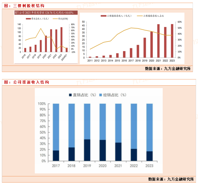 三棵树2023年,实现营收 124.8 亿元。分渠道看,2023 年经销/直销收入 101.7/20.6 亿元,同比+18.3%/-10.9%,占比 83.1%/16.9%,公司近几年加快布局零售及小 B 业务,经销占比进一步提升。分产品看,家装墙面漆/ 工程墙面漆收入 26.3/46.8 亿元,同比+2.6%/+9.5%。公司工程墙面漆占比37.5%营收,是公司最大业务。