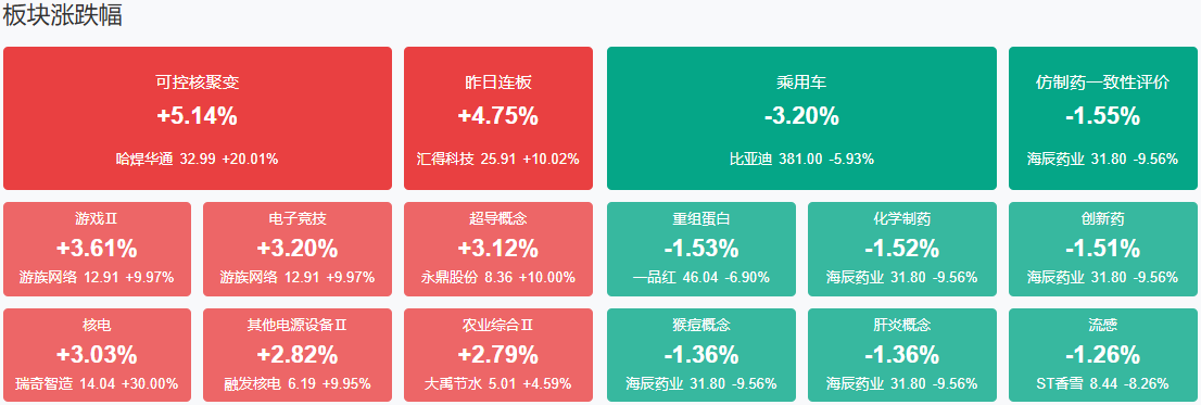 板块方面,可控核聚变、智能物流、PEEK材料、IP经济等板块涨幅居前,创新药、汽车整车、中药、维生素等板块跌幅居前。截至收盘,沪指跌0.05%,深成指跌0.41%,创业板指跌0.8%。