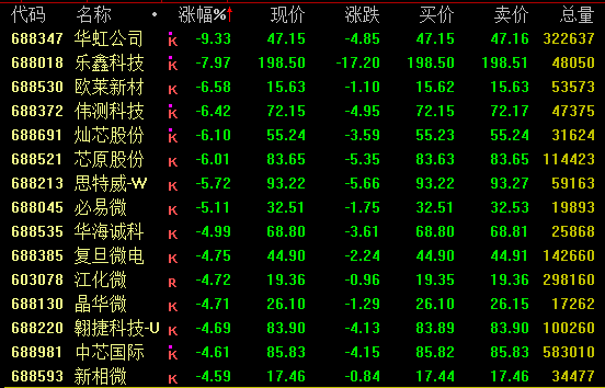 半导体板块今日大幅下挫,截至收盘,华虹公司跌超9%,盘中一度大跌12%;乐鑫科技跌约8%,芯原股份、灿芯股份跌超6%,中芯国际跌近5%。