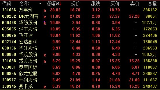 纺织服装板块盘中强势拉升,截至收盘,万事利20%涨停,太湖雪涨近12%,华纺股份、迎丰股份、华升股份等均涨停。