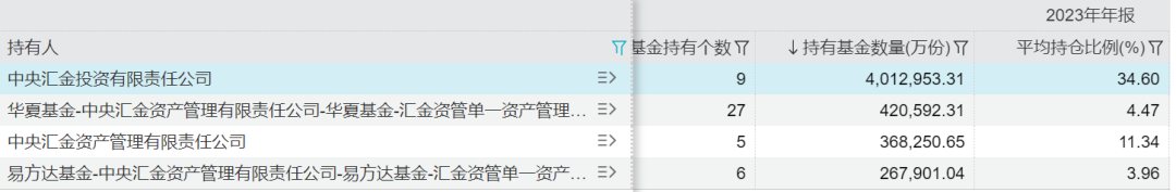 Wind统计的上市基金前十大持有人数据显示,截至2023年年末,中央汇金投资有限责任公司、中央汇金资产管理有限责任公司、华夏基金-汇金资管单一资产管理计划、易方达基金-汇金资管单一资产管理计划合计重仓持有了506.97亿份上市基金。