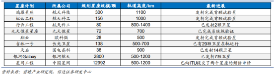 2016-2018 年间,航天科技、航天科工、中国电科、中国电信等企业纷纷提出了各自的低轨互联网星座建设方案,并陆续发射了试验星。