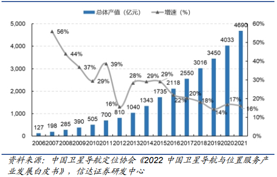 随着北斗三号全球系统完成组网,高精度位置服务已经深度融入各行各业,与大数据、物联网、人工智能等新兴技术深度融合,“十四五”末我国北斗产业总体产值有望达到8000-10000亿。据中国卫星导航定位协会《2022 卫星导航与位置服务产业发展白皮书》数据:2006-2021年,我国卫星导航与位置服务产业整体产值自127亿元增至4690亿元,CAGR为27%。