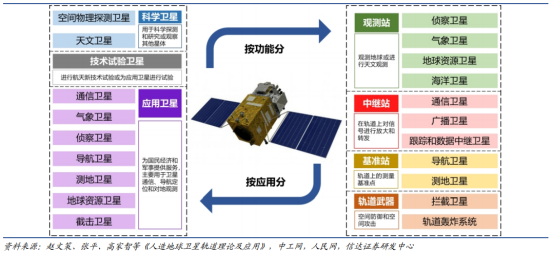 卫星,被定义为环绕地球在空间轨道上运行的无人航天器,其中人造卫星是发射数量最多、用途最广、发展最快的航天器,其发射数量约占航天器发射总数的 90%以上。按照用途可以分为科学卫星、技术试验卫星、应用卫星;按照功能,可以分为观测站、中继站、基准站、轨道武器四类;根据卫星不同功能,将卫星分为通信卫星、导航卫星、遥感卫星、侦察卫星、资源卫星和天文卫星等六大类。