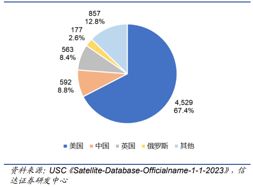 根据 UCS《Satellite-Database-Officialname-1-1-2023》数据,截至2022年12月31日,全球共有6718颗在轨运营卫星。1)按照国别统计:美国4529颗(约占全球的67.4%),中国592颗(约占全球的8.8%),英国563颗(约占全球的 8.4%),俄罗斯177颗(约占全球的2.6%)。2)按照卫星用途统计:通信卫星4823颗(占72%)、导航卫星155颗(占2%)、遥感卫星1192颗(占18%)。3)按照轨道类型统计:LEO/MEO/GEO/Eliptical轨道卫星分别有 5937/142/580/59 颗。