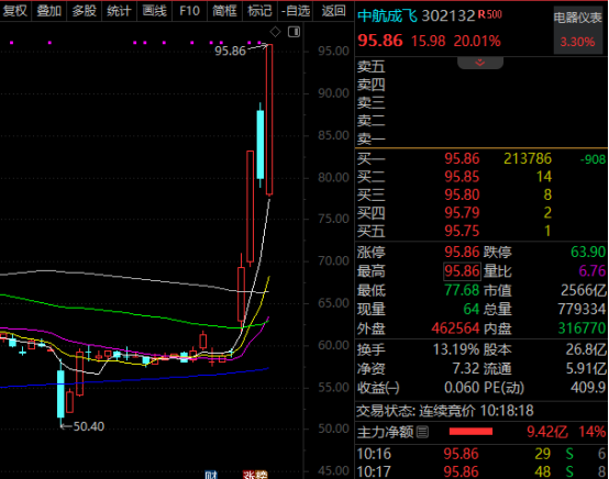 除了中航成飞,航天南湖、华如科技等个股“20cm”涨停,宏达电子、成电光信、*ST天微等个股大涨逾12%,中超控股、雷科防务、苏州龙杰等个股涨停。