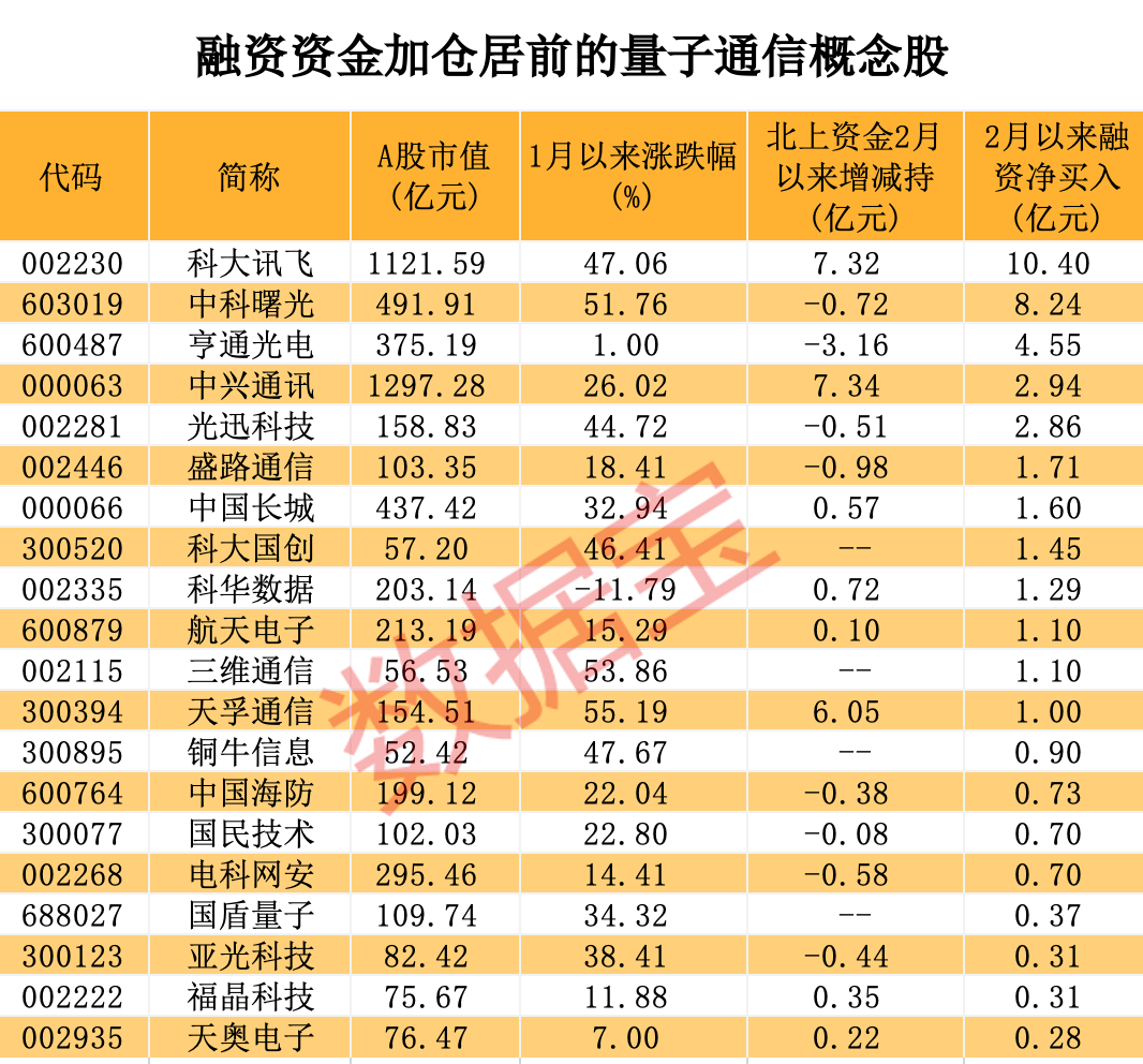从资金流向来看,2月以来融资资金累计加仓量子通信概念股达到38亿元。11股融资净买入超亿元,其中科大讯飞、中科曙光、亨通光电、中兴通讯、光迅科技融资净买入逾2亿元。在此期间,按照区间成交均价计算,北上资金同时增持超亿元的仅中兴通讯、科大讯飞,这2只股A股市值均超过千亿元。