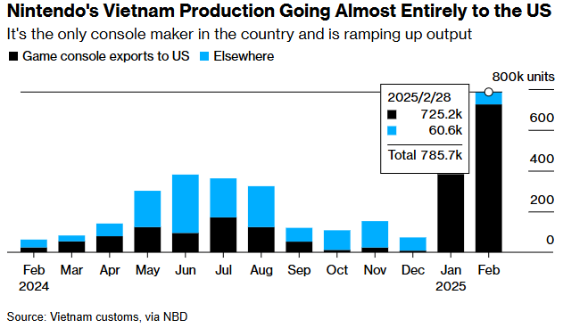 任天堂的合作伙伴星电公司今年初已将越南工厂的几乎所有产能投入美国市场,表明囤货行动已在进行中。个人电脑制造商同样在今年第一季度加速向美国发货,以应对潜在的关税政策。