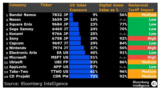 BI分析师内森·奈杜表示,由于硬件业务和实体商品运输需求,游戏机制造商是电子游戏行业中最脆弱的环节。索尼29%的收入和任天堂37%的销售额都来自美国市场。这一市场对两家公司不可或缺:美国消费者引领全球趋势,口碑传播能提振娱乐产品需求。