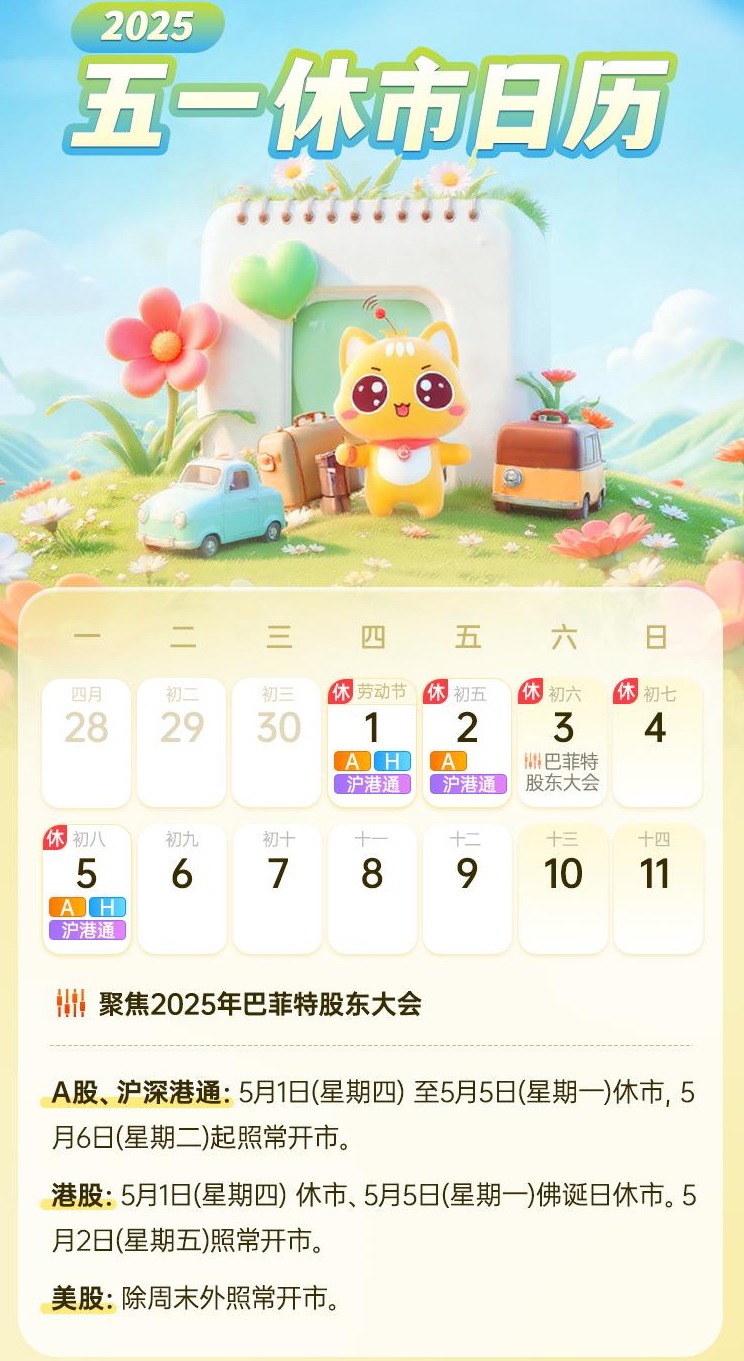 2025年五一“黄金周”即将到来,本次假期自5月1日至5月5日,共5天。A股、沪深港通将自5月1日周四起休市(暂停交易),5月6日周二开市(恢复交易)。港股5月1日(周四)、5月5日(周一佛诞日)各休市1天。海外美股除周末外均照常开市。