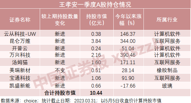 一季报显示,王孝安在一季度持股8家公司,其中7家公司为新买入公司,1家公司被减持,以5月5日收盘价计算,王孝安合计持股市值超10亿元。