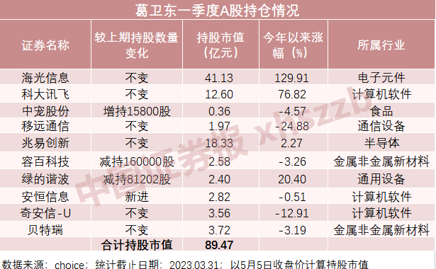 一季度末,葛卫东及其公司持股10家公司,其中新买入1家公司——安恒信息,减仓2家公司——容百科技、绿的谐波,合计持股市值超89亿元。