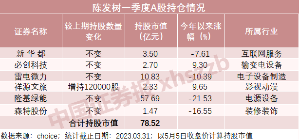 一季报显示,陈发树在一季度共持股6家公司,其中加仓1家影视动漫公司——祥源文旅,以5月5日收盘价计算,陈发树合计持股市值达78.52亿元。