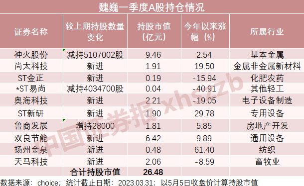 一季报显示,魏巍依旧偏爱传统行业,其在一季度持股10家公司,其中新进7家公司,减仓2家公司,加仓了鲁商发展,以5月5日收盘价计算,魏巍合计持股市值超26亿元。