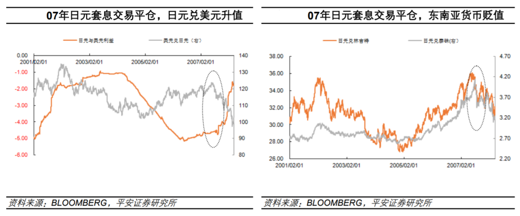 2006年底日本量化宽松结束时的情形:在2001年到2006年间,为了应对国内经济的持续下滑与投资衰退,日本央行在利率极低的情况下推行量化宽松政策,而同一时期发达市场以及新兴市场经济体基本维持较高的利率水平,日元套息交易逐步流行,美联储在2004年进入加息周期后,美元也成为日元套息交易的对象。