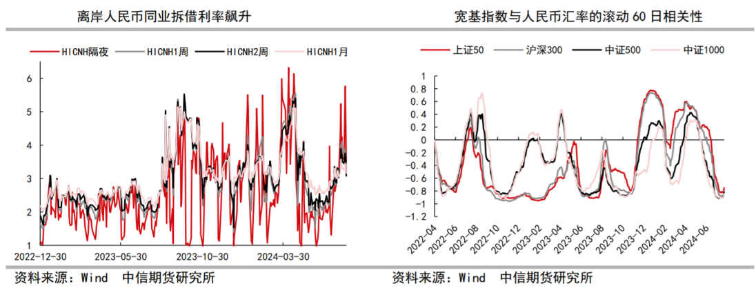 一是影响人民币汇率,并向中证1000传导。周内资金流出美国,美元相对贬值,离岸人民币需求增加,同步在离岸收紧流动性,CNH同业拆借利率飙升至约6%,接近4月中旬水平。中美利差收窄,催化人民币跟随日元升值,在岸、离岸汇率最低分别逼近7.21、7.20。