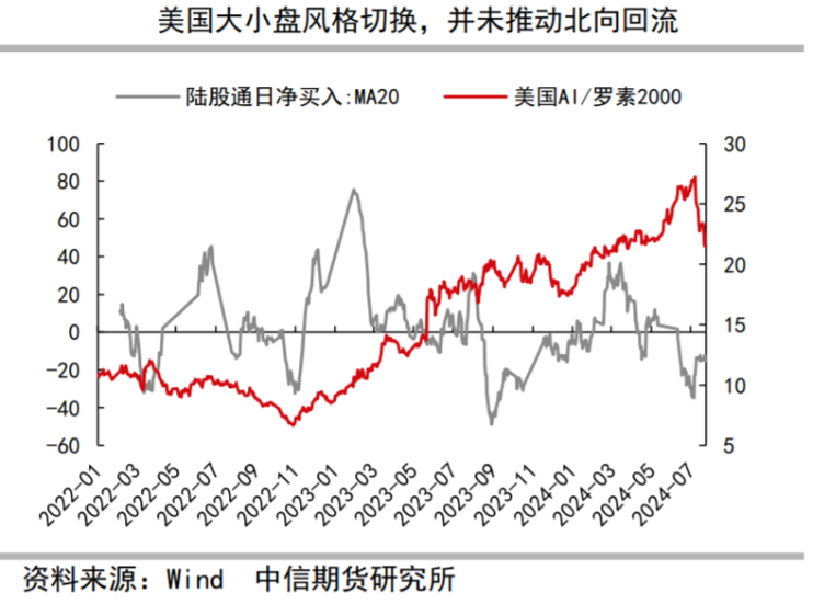 三是北向资金回流的动力依然偏弱。虽然套息交易逆转,但美股呈现大小盘风格切换,依然有罗素2000为代表的投资主题。部分资金平仓日元空头,回流日本,但仅基于日元的独特属性,并未向其他市场扩散,A股的陆股通在周内依然呈现净流出。