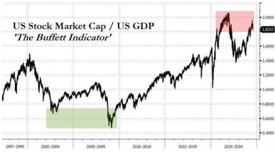 反应市场是否过热的巴菲特指标(股市总市值/GDP的比值)现已飙涨至180%上方,表明市场严重被高估。