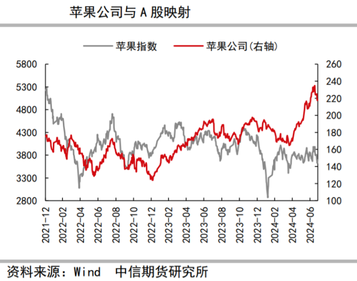 二是美股AI在A股的映射,英伟达链的关联性较果链更高。全球AI主题投资下,A股资金也寻找对应题材个股,主要是产业链合作关系的公司。其股价波动与美股龙头股价波动高度相关,英伟达链、果链分别锚定英伟达、苹果股价,近期共同承压回撤。A股走势相对较弱,英伟达股价上一轮回撤时,英伟达链已见顶,上周继续共振下跌,果链情况也类似。