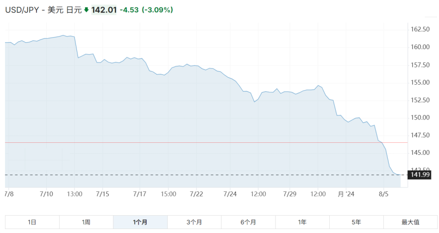 事件一:全球哀鸿遍野,日股进入熊市,纳指期货大跌4%。受疲软的美国就业及经济数据打击,叠加日元飙升和中东地缘政治紧张局势,全球投资者的信心受挫,周一全球股市继续遭重挫。日元套息交易触发逆向交易,即抛售美股,回收美元,再兑换成日元,偿还日元借款。日经指数创下史上最大下跌点数,超越1987年10月黑色星期一的纪录。