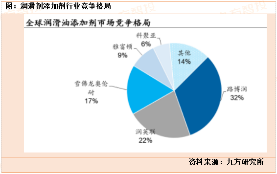 全球润滑油添加剂市场目前路博润(Lubrizol)、润英联(Infineum)、雪佛龙奥伦耐(ChevronOronite)、雅富顿(Afton)为主的市场竞争格局,全球 CR4 在 85%左右。四大润滑油添加剂公司以销售复合剂为主。