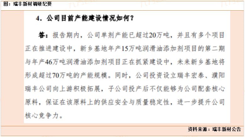 瑞丰新材业绩展望: 润滑油添加剂复合剂方面,公司目前已自主掌握了 CD 级、CF-4 级、CH-4 级、CI-4 级、CK-4 级柴油机油复合剂配方工艺,SE 级、SF 级、SG级、SJ 级、SL 级、SM级、SN级、SP 级汽油机油复合剂配方工艺以及天然气发动机油复合剂、摩托车油复合剂、船用系统油、船用汽缸油复合剂、抗磨液压油复合剂、齿轮油复合剂等配方工艺,其中 CI-4、SN、SP 级别复合剂已经通过国外权威的第三方台架测试机。