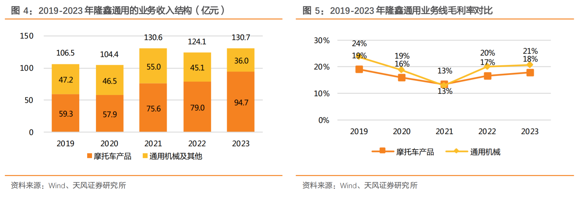 隆鑫通用自2021年重新调整明确发展战略以来,聚焦“摩托车+通机”业务,毛利率改善明显。