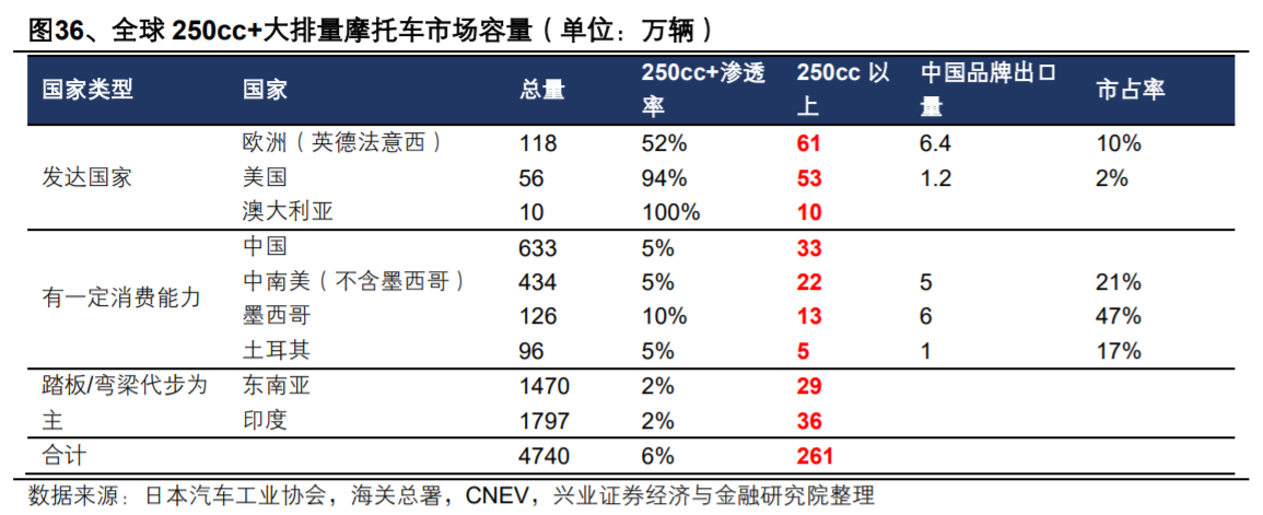 国内大排量摩托车自2019年加速兴起,渗透率加速提升,250cc以上销量五年CAGR达33.67%。