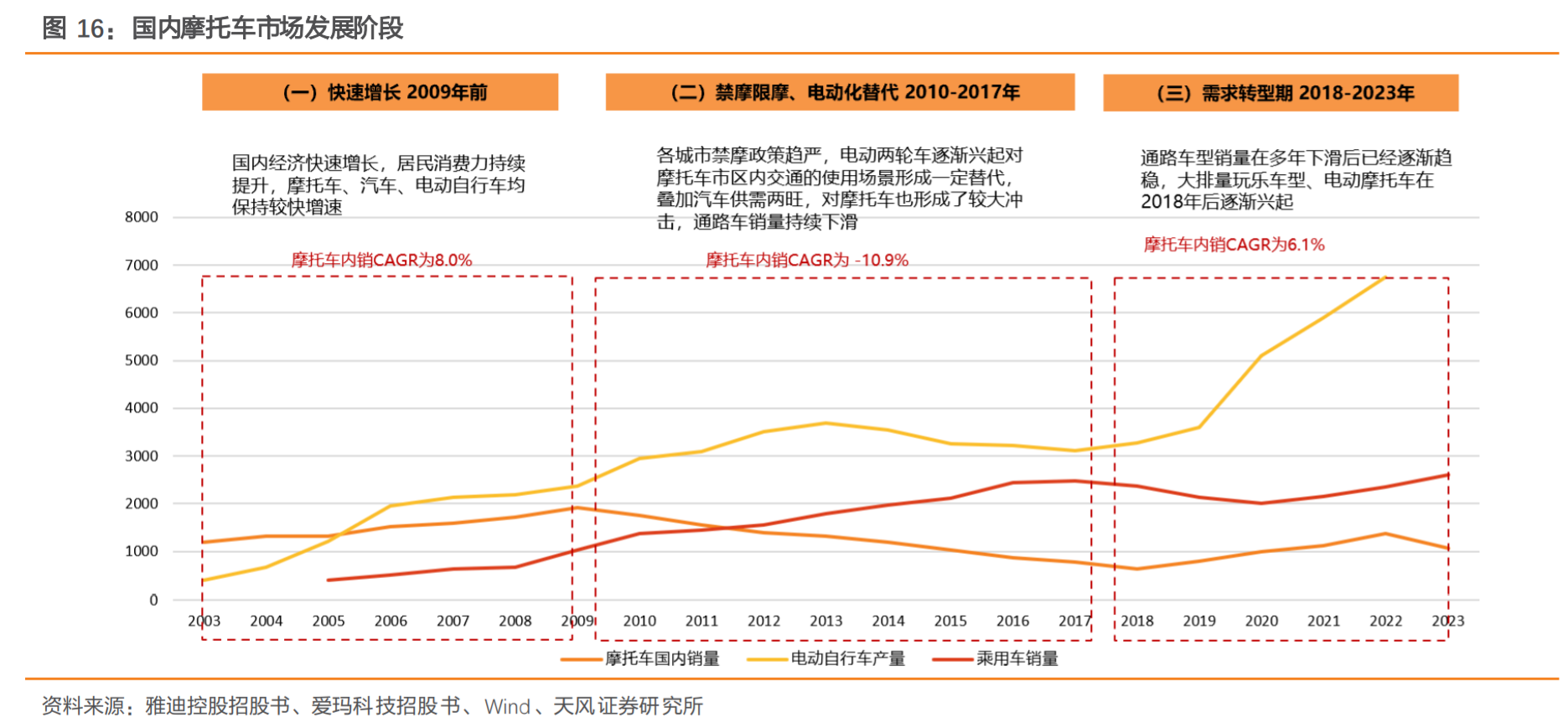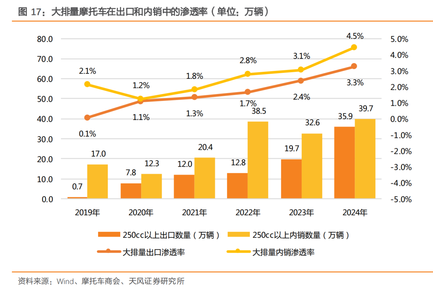 24年,国内大排量摩托车消费开始恢复,出口与内销分别同比增长81.9%、21.8%,渗透率提升至3.3%、4.5%。