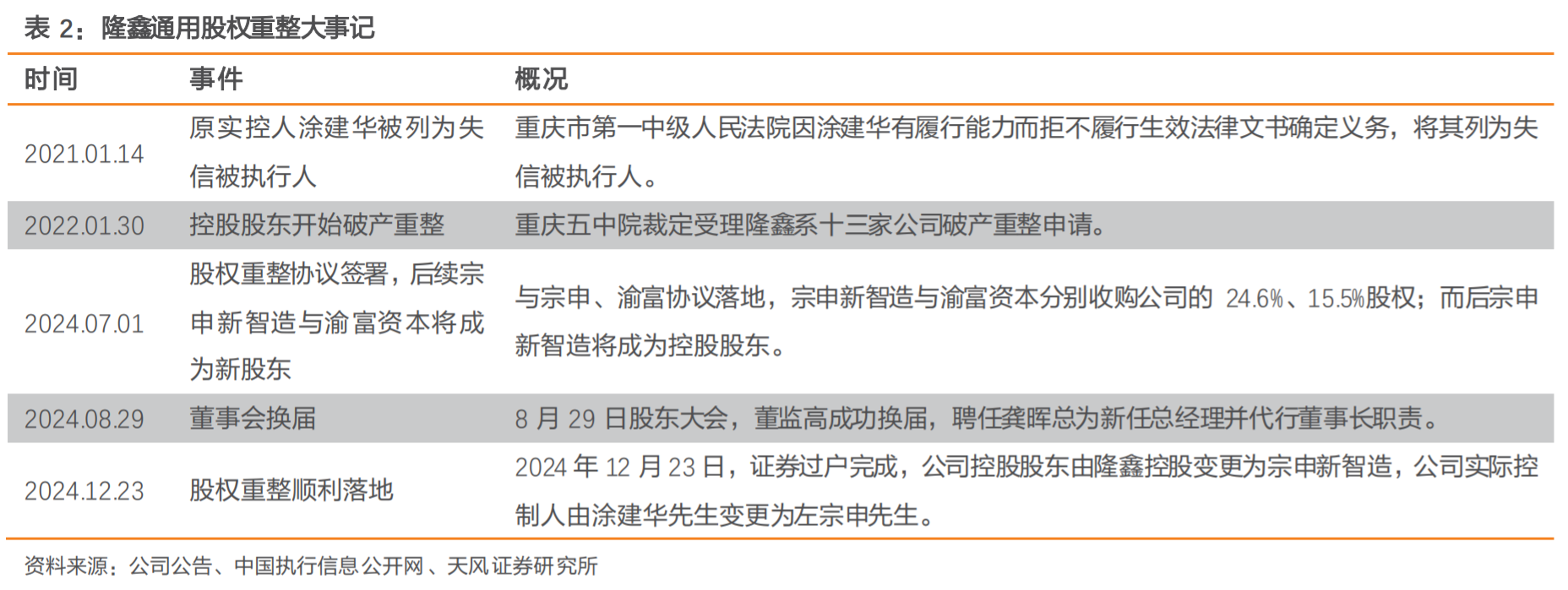 2024年12月23日,隆鑫通用资产重整股权交割完毕,宗申新智造成为隆鑫通用第一大股东、控股股东,左宗申先生成为隆鑫通用的实控人。这一变动有望为隆鑫通用带来与宗申在产品研发、生产制造、市场营销、渠道等方面的深度协同。