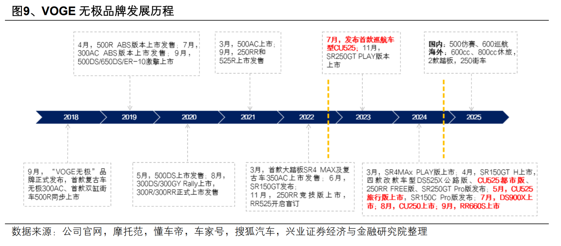 (1)内销:2025年内销增长主要聚焦仿赛、巡航等新品。2025年无极将推出RR500S、CU625等新品,卡位主流赛道主流排量段,月销量有望再上台阶。