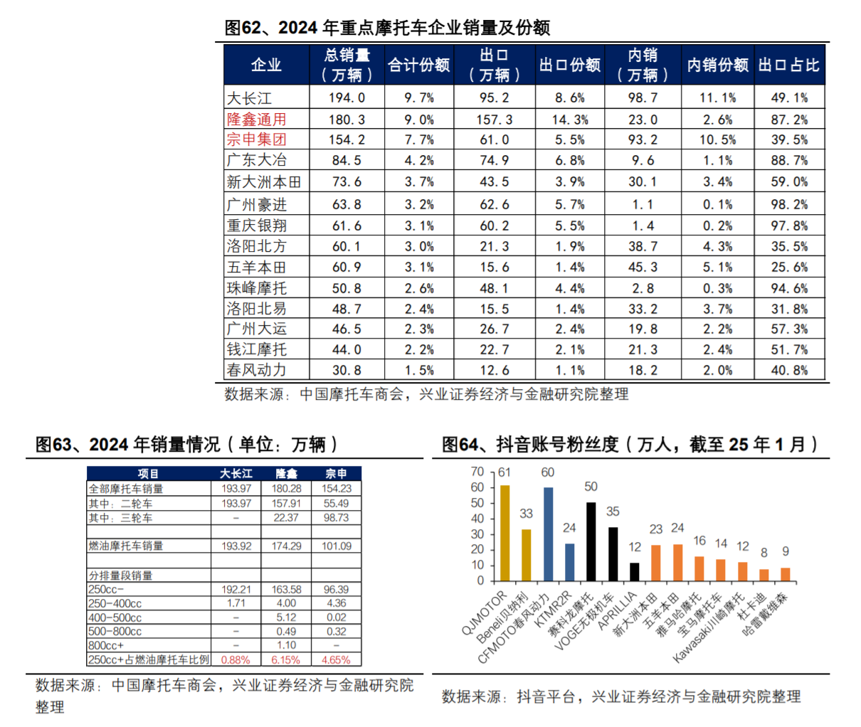 资产重整后宗申入主,摩托车业务有望实现协同。2024年12月23日,隆鑫通用资产重整股权交割完毕,宗申新智造成为隆鑫通用第一大股东、控股股东,左宗申先生成为隆鑫通用的实控人。2024年,隆鑫/宗申摩托车销量分别为180/154万辆,分别位居行业第二和第三,合并后摩托车总销量和出口量将跃居行业第一。此外,隆鑫和宗申拥有无极和赛科龙大排量自主品牌,合并后大排量将稳居行业前三,在产品研发、生产制造、市场营销、渠道等方面有望实现协同。