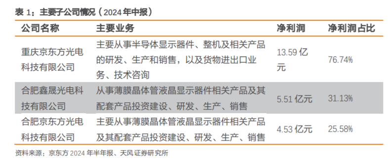 利润来源主要集中在重庆、合肥三家子公司,重大项目第8.6代AMOLED产线提前封顶。公司利润来源主要集中在重庆京东方光电、合肥鑫晟光电、合肥京东方光电三家子公司,2024年这三家子公司净利润分别为27.07亿元、16.05亿元、9.23亿元,合计52.35亿元,占公司归母净利润的比重约98.3%。重大项目方面,2024年,公司第8.6代AMOLED产线提前封顶,新建第6代LTPOLCD产线首款产品提前点亮,公司重大项目稳步推进。