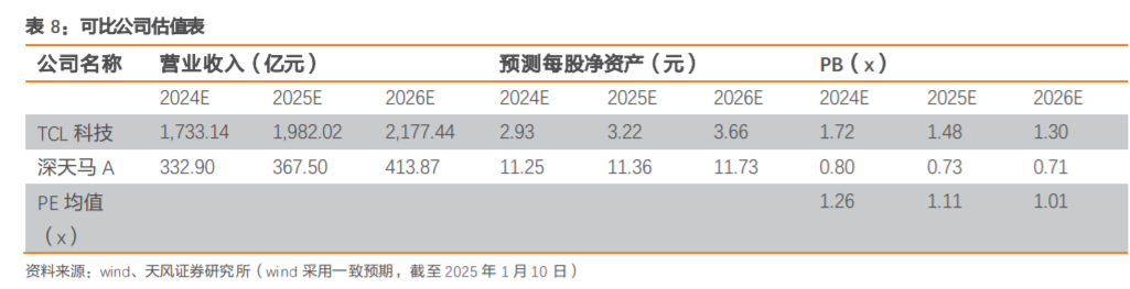 估值方面,选取TCL科技与深天马A为可比公司,对应2025年平均PB倍数为1.11倍,基于LCD长期供需格局持续优化,京东方在该领域五大主流应用出货量稳居全球第一,随着10.5代TFT生产线将于2025年开始完成设备折旧,公司预计折旧退出,利润率提升;叠加OLED在新产品、新客户的拓展,带来较高的业绩弹性,考虑到公司OLED业务规模较大且具备较高成长性,故给予公司高于可比公司平均的1.5倍PB,预计公司2025年每股净资产3.73元。