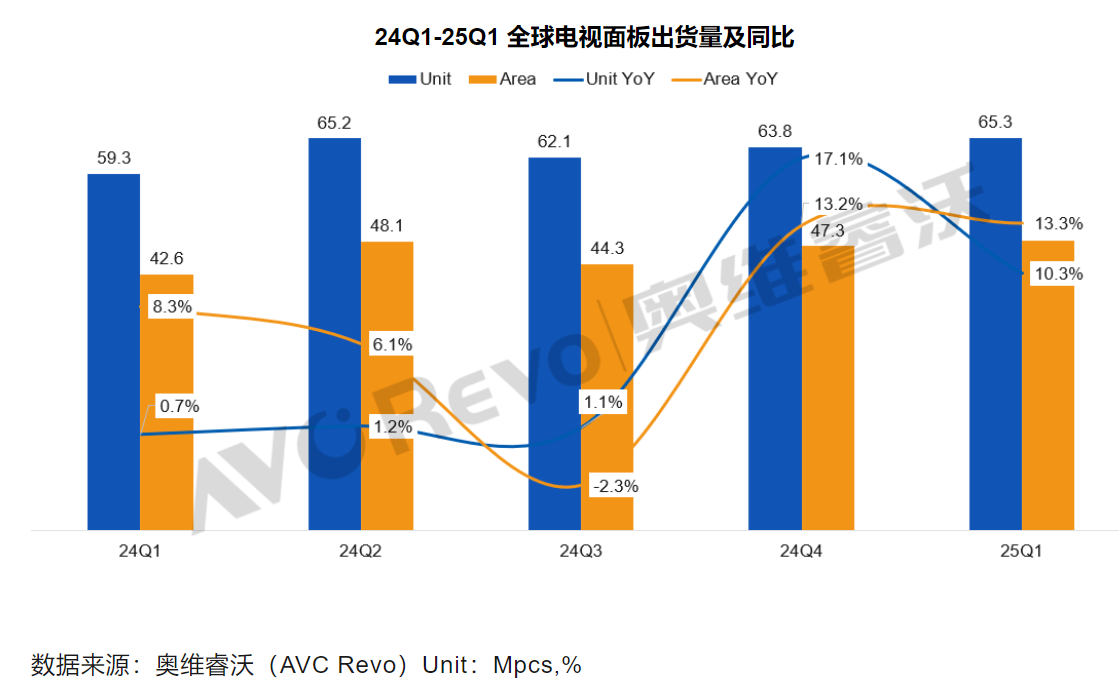 1)根据奥维睿沃(AVCRevo)《AVC产业链-全球电视面板产销存月度报告》数据显示,2025年Q1全球TV面板出货达到65.3M,同比成长10%。其中LCDTV面板出货64.0M,同比增长10%,OLEDTV面板出货1.4M,同比增长12%。