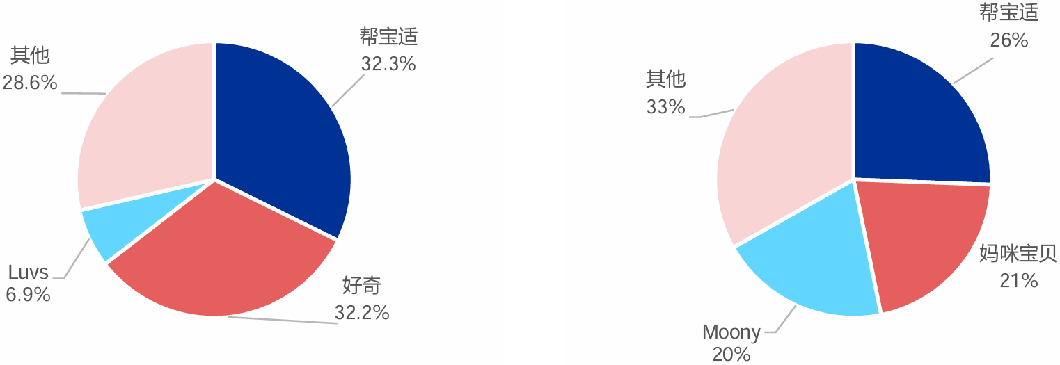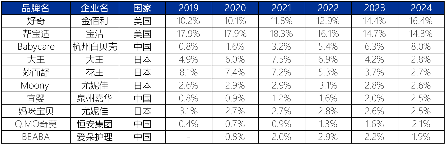 2024年中国婴儿尿裤品牌CR10为55.8%。根据欧睿咨询数据统计,2024年中国婴儿尿裤品牌CR10为55.8%,其中好奇(美国金佰利)、帮宝适(美国宝洁)位列第一、第二名,市占率分别为16.4%、14.3%。第三名Babycare为中国品牌,近年来份额快速提升,2024年市占率为8.0%。而近年来日本品牌如大王(大王公司)、妙尔舒(花王公司)、尤妮佳公司的Moony、妈咪宝贝品牌份额均有所下滑。