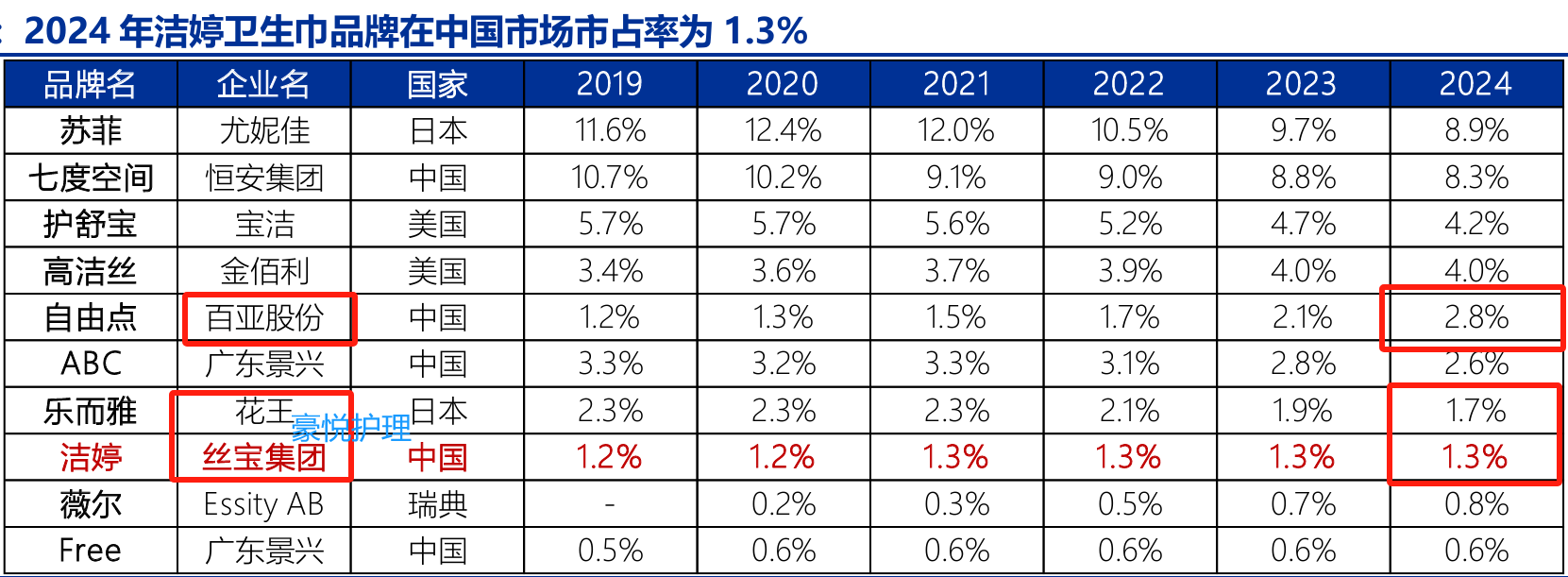 根据欧睿咨询统计,2024年“洁婷”卫生巾品牌在中国市场市占率为1.3%,位列第八名。“洁婷”品牌畅销产品有“透气极薄”、“樱肌感”等产品系列。豪悦收购湖北丝宝后,在沿用洁婷原有品牌标签的基础上,对其进行供应链、资金、管理等赋能,“洁婷”品牌有望发力。