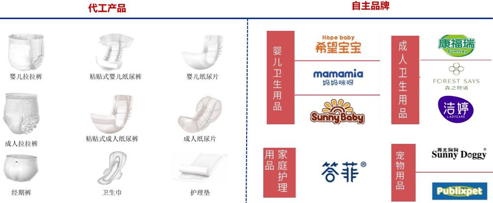 豪悦护理是国内卫生护理用品龙头之一,深耕卫生护理用品,代工为基品牌添翼。公司代工业务基石稳固,产品、客户资源优势显著,逆势收购优质产能,持续夯实竞争力。同时公司内生外延逐步拓展自主品牌,打开品类及成长空间,培育“答菲”(湿厕纸、湿巾)品牌,积极发力电商,2025年收购“丝宝护理公司”,多维度赋能“洁婷”卫生巾品牌,未来增长值得期待。